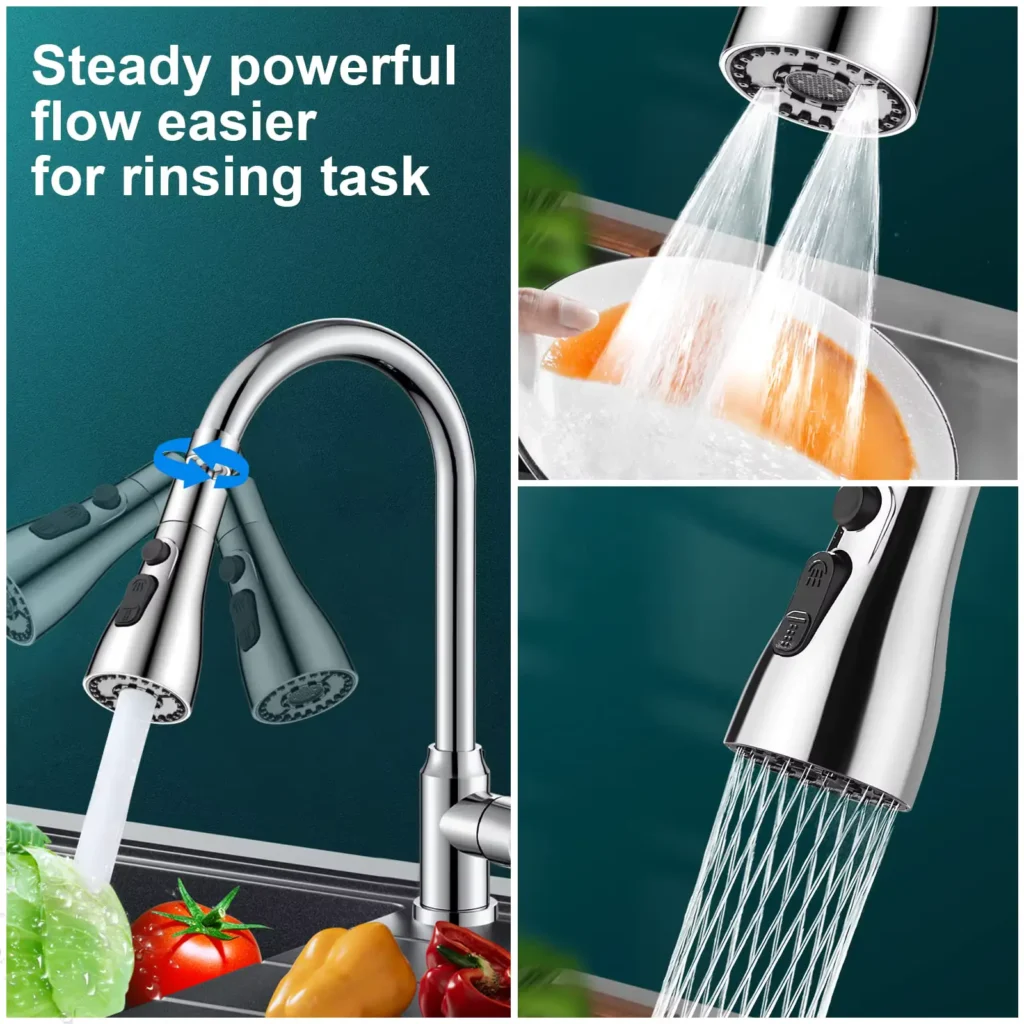 🚿 3-v-1 vodni sistem – Preklopite med močnim pritiskom, mehkim tokom ali širokim razpršilcem – idealno za pomivanje posode, izpiranje zelenjave ali čiščenje korita.